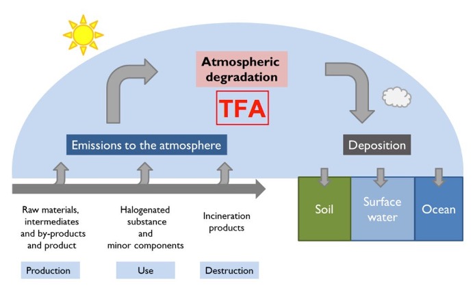 Note: The diagram below illustrates refrigerant atmospheric degradation and PFAS emission pathways — not mechanical filtration systems.